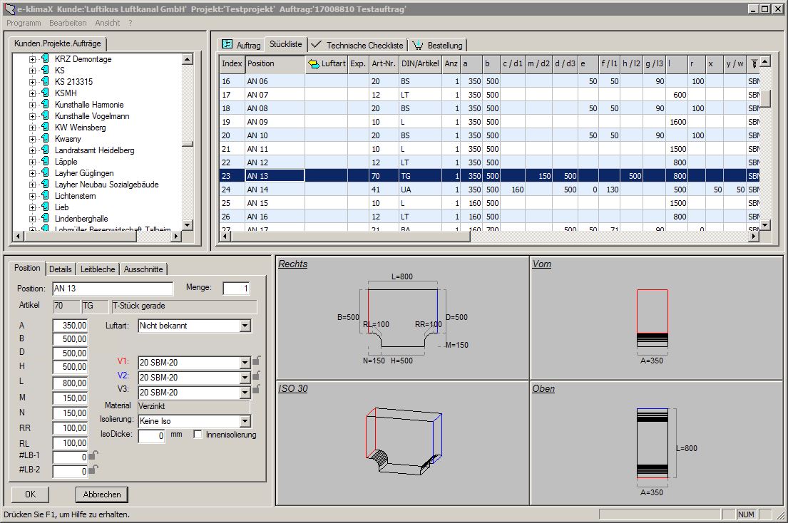 Mit e-klimaX geben SIe Ihre Stücklisten am Grafikbildschirm ein. Die eingegeben Maße werden sofort in 4 Ansichten angezeigt.