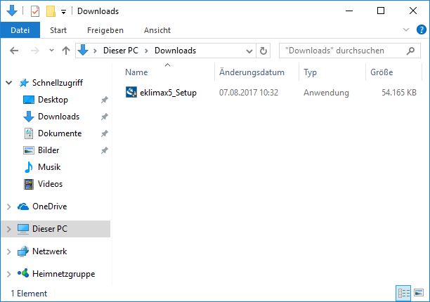 Öffnen Sie die heruntergeladene Setup-Datei per Doppelklick: Beim Programmupdate eklimax6_update_ger.exe bzw. eklimax6_setup_ger.exe bei der Neuinstallation.