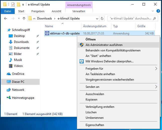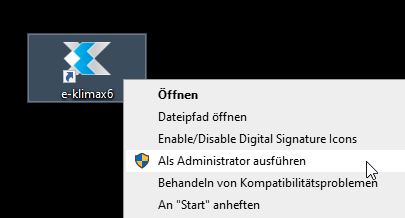 Führen Sie e-klimaX als Administrator aus indem Sie mit der rechten Maustaste auf das e-klimaX-Symbol auf Ihrem Desktop klicken.