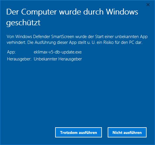 Unter umständen erhalten Sie von Windows Defender folgende Meldung. Klicken Sie in diesem Falle auf den Link innerhalb der Meldung Weitere Informationen…