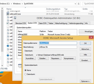 Windows-Unterordner SysWOW64 → odbcad32.exe → System DSN → eKlimax 2000 → Konfigurieren… → Auswählen… → Pfad zur Datenbank „eKlimax2000.mdb“ einstellen