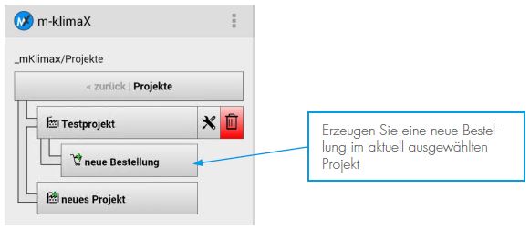 Die Projekte, Bestellungen und Bauteile werden in einer 3-stufigen Struktur in m-klimaX geordnet. An erster Stelle steht ein